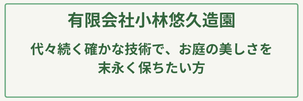 | 対応サービス | 庭園設計・施工(作庭)、庭木剪定、伐採、消毒・施肥、雑草対策(草刈り・防草)、冬囲い、庭じまい、外構工事 |
