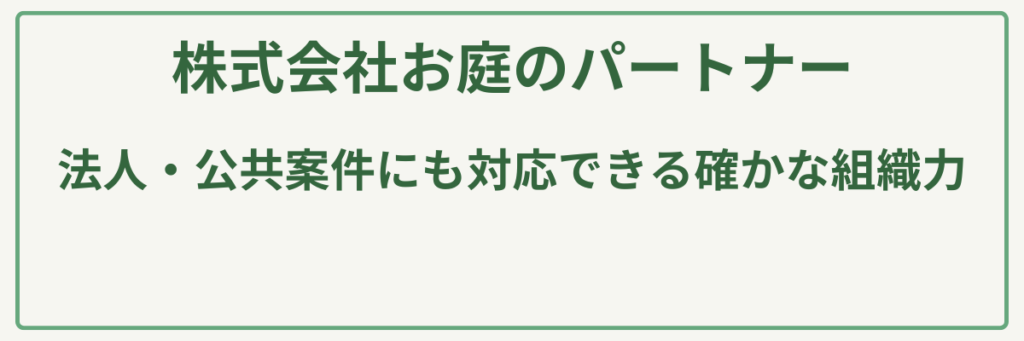 | ポイント | 外構・エクステリア専門店/専門プランナー在籍/3Dパースによるデザイン提案/年間植栽管理(法人・集合住宅対応)/千葉・東京・埼玉の広域対応/アフターケア充実 |