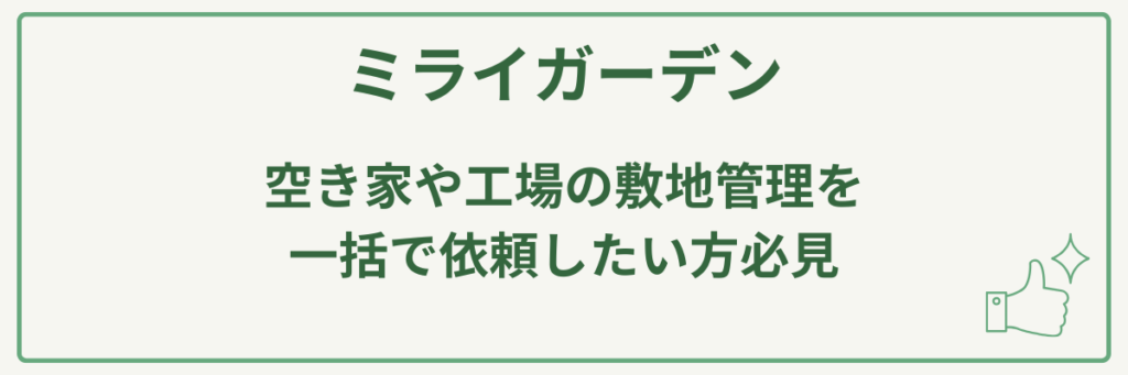 | 対応場所 | 個人宅、工場、空き家、その他敷地管理 |