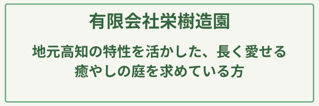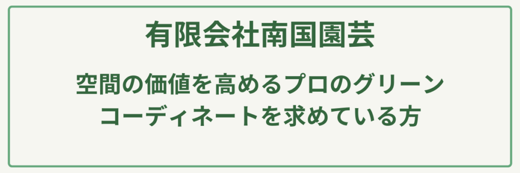 | ポイント | 高知の気候・風土に適した「失敗しない」植物選定/新築外構のトータルプランニングからリフォームまで幅広く対応/才谷龍馬公園の管理実績に裏打ちされた高度な技術力/施工後の保証や定期メンテナンスなど充実のアフターサービス |