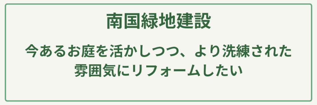 高知県高知市を拠点とする南国緑地建設は、「限りないみどりの追求」をミッションに掲げ、多様なライフスタイルに寄り添うお庭づくりを提案する造園のスペシャリストです。和洋問わない個人庭園の施工はもちろん、「Ruhe(ルーエ)」という室内から庭を楽しむスタイリッシュでラグジュアリーな空間提案など、デザイン性の高いお庭づくりに強みを持っています。また、既存のお庭に新たな息吹を吹き込む「リガーデン」にも力を入れており、一本の植木や小さなエクステリアの追加で、暮らしを豊かに変える提案を行っています。 施工事例が豊富で、植栽や外構の参考単価を公開するなど透明性の高い運営を行っているため、「プロの確かなセンスで、デザインにこだわった安らぎの空間を作りたい方」や「今あるお庭を活かしつつ、より洗練された雰囲気にリフォームしたい方」に非常におすすめの造園店です。