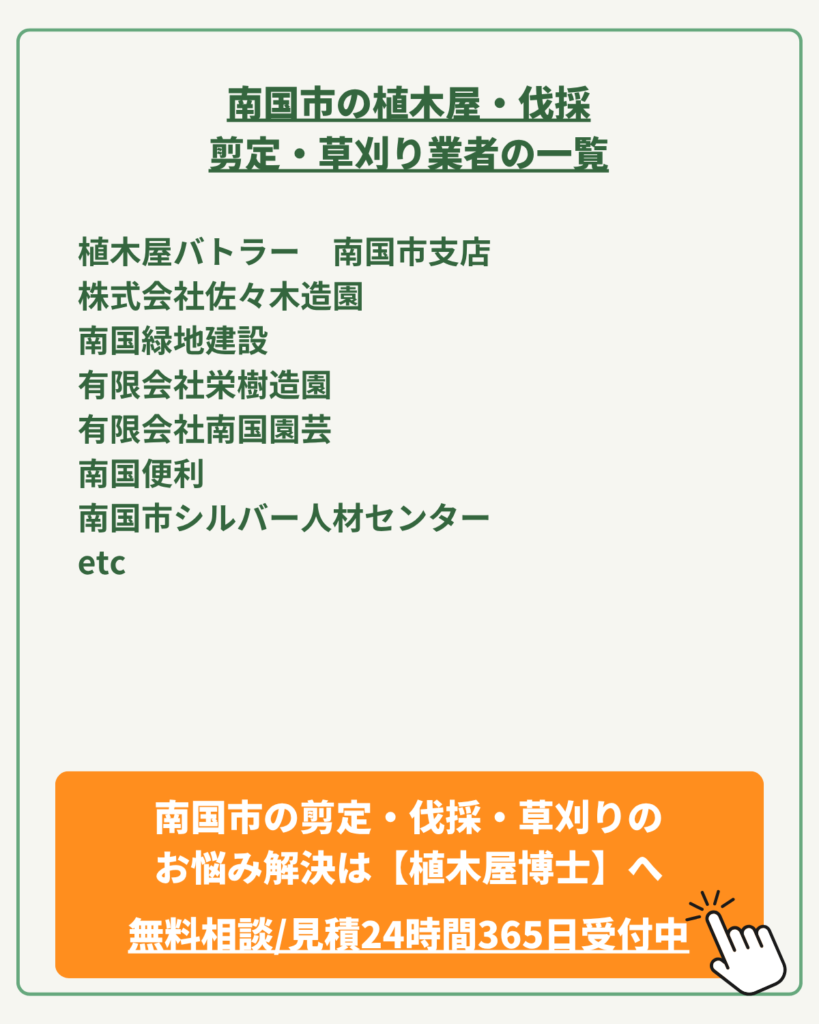 植木屋(剪定・伐採・草刈り業者)選びでお悩みの方は、是非この機会に植木屋博士の無料相談・無料見積をご活用ください。