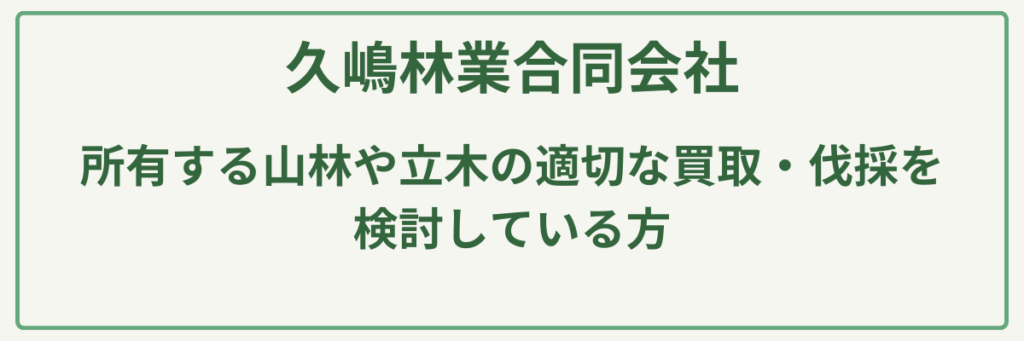 | 対応サービス | 森林土地の買取、素材生産業(立木伐採・搬出)、木材販売(国内・海外)、バイオマス材の取扱い、山林管理 |