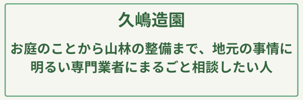 | 対応サービス | 植木剪定、除草、植栽、庭園工事全般、山林の下刈り・植え付け、土木工事(下請け含む) |