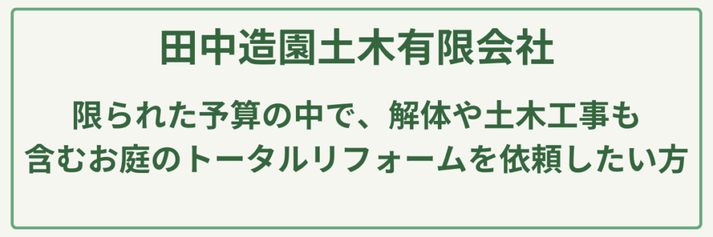 | 対応サービス | 造園工事(和風・洋風庭園、ガーデニング)、外構・エクステリア、緑地管理、解体工事、土木一式工事、カッター工事 |