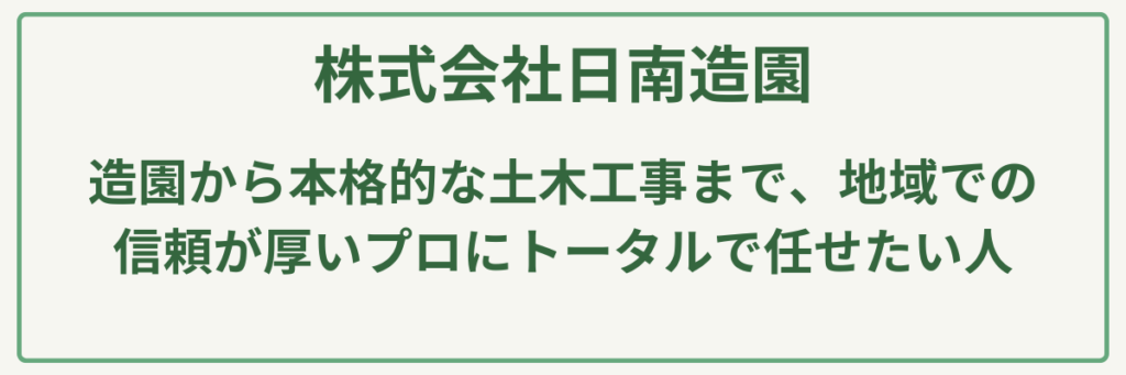 | ポイント | 日南・串間地区に深く根ざした、地域密着型ならではの迅速で親身なサポート体制/お庭の設計から解体・土木工事までを一括して請け負える、総合建設業としての高い技術力/公共公園の設計施工や緑化事業も手がける、信頼性の高い施工品質と管理能力/「快適で豊かな空間」をお手頃価格で提供することを目指す、ユーザーに寄り添った価格設定/お客様の具体的なイメージを大切にしながら、完成後の生活まで見据えた丁寧なヒアリングと提案 |