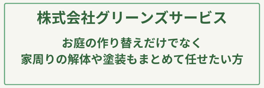 | 対応サービス | 庭木の剪定・伐採、除草(草刈り)、芝張り、消毒、外構工事(フェンス・ウッドデッキ等)、空き地・空き家管理 |