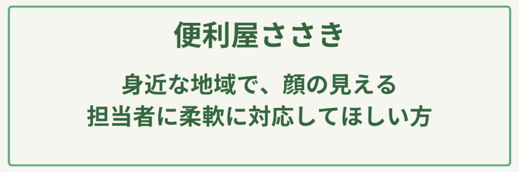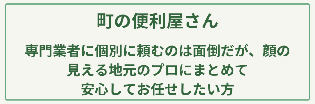 | 対応サービス | 庭のお手入れ(除草・剪定等)、不用品回収・買取、遺品整理(認定店)、エアコン・洗濯機クリーニング、住宅リフォーム、水回り修理(詰まり・水漏れ)、荷物移動・引越し、買い物代行、電球交換 |