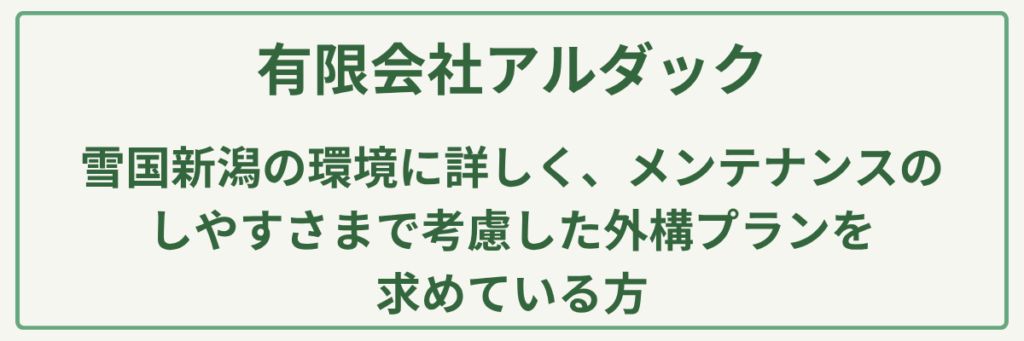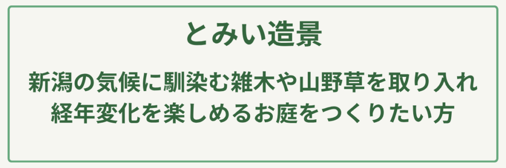| ポイント | 新潟市を中心に長岡市や三条市など、下越・中越エリアを幅広くカバーする対応力/自然素材や植物の力を活かした、住む人の心に寄り添う「癒やしの空間」づくり/概算見積りシステムの導入など、スピード感と透明性のある情報提供/スタッフブログ等を通じた、植物の知識や日々の活動が見える安心感 |