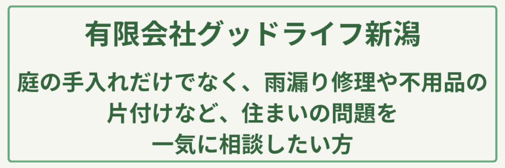 | ポイント | 祝・20周年!新潟市西区で長年選ばれ続けてきた信頼と実績。地域事情を熟知した細やかなサービスが魅力/除草作業1㎡330円〜、お墓掃除5,500円〜など、小規模な作業から手軽に頼める明朗な料金体系/お庭の管理から、ハチ駆除、リフォーム、遺品整理まで「住まいの主治医」のように何でも相談できる圧倒的な網羅性/県外在住の方からの「新潟にある実家の空き家管理」や「お墓参り代行」の依頼も歓迎。遠方からのニーズにも誠実に対応 |