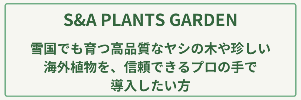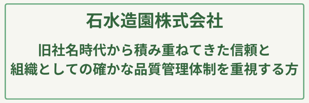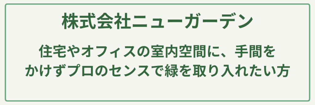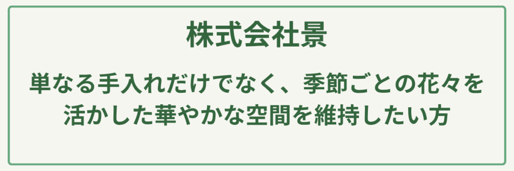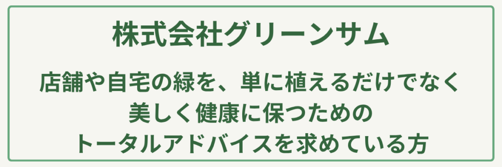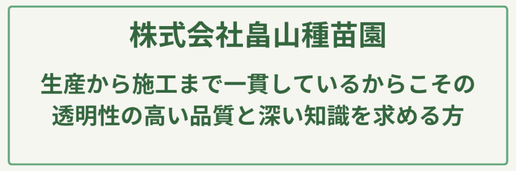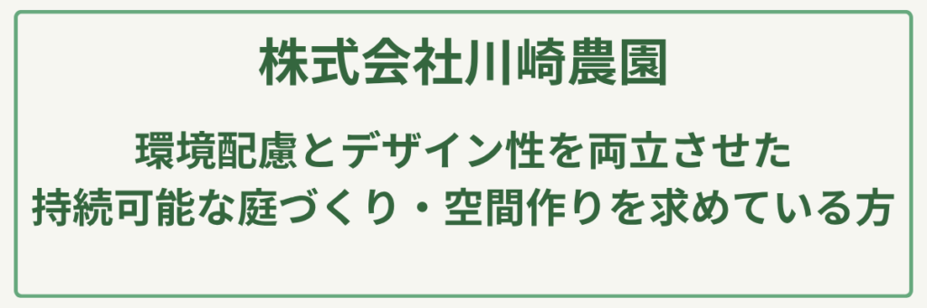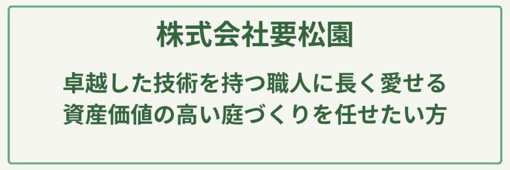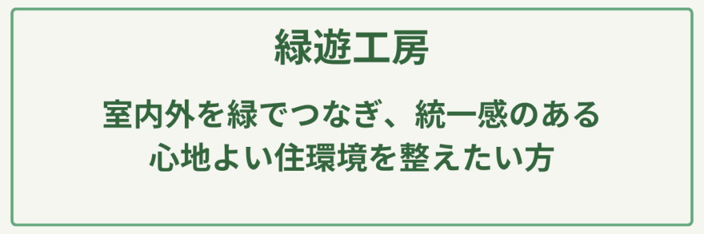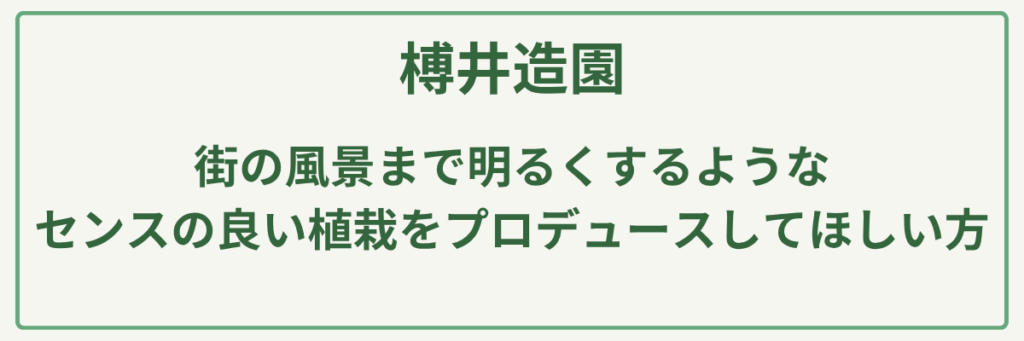 | 対応サービス | 造園工事・設計、緑地維持管理、庭木販売、ガーデンメンテナンス、外構・エクステリア、インドアグリーン提案 |