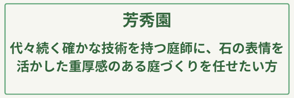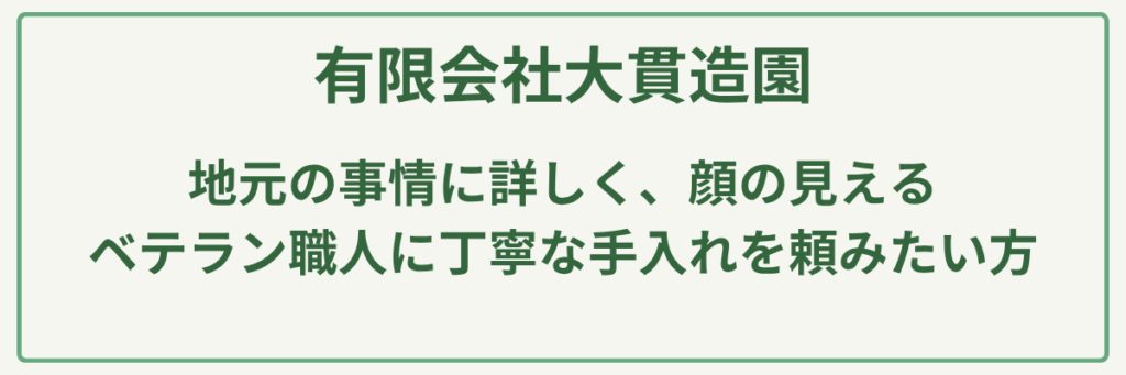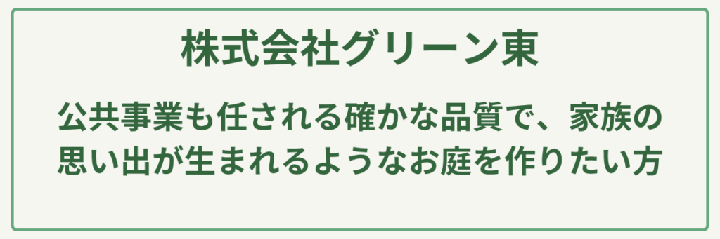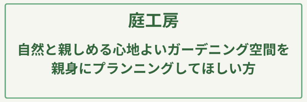 | ポイント | 創業20年以上の経験に基づく、家族の暮らしを豊かにする庭づくり/代表直通の電話・メールで、小さな疑問も気軽に相談できる安心感/HP上で明確な料金表(作業お値段表)を公開している透明性の高さ/リピーターが多く、シーズンごとの丁寧なメンテナンス体制が整っている |