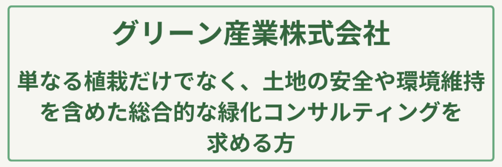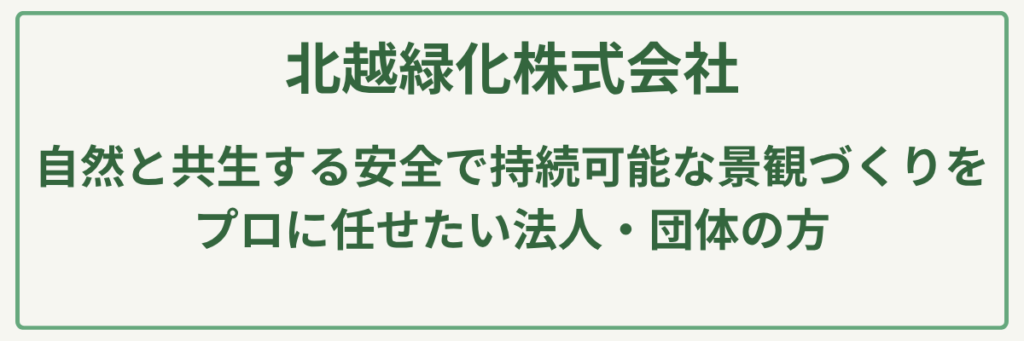| 対応サービス | 造園・修景工事、緑地維持管理(芝生・樹木管理)、病害虫防除(松くい虫等)、法面保護工事、都市・教育・道路環境整備 |