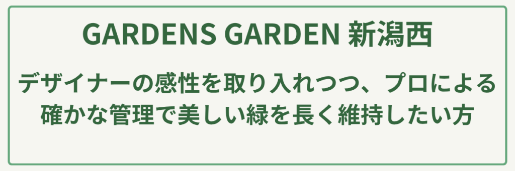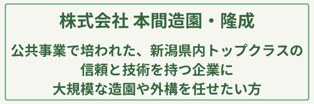 | ポイント | 創業50年の歴史に裏打ちされた、新潟市西区を代表する造園・緑化の技術力/自社で緑化木の生産を行っており、質の高い樹木を直接提供できる強み/公共工事から個人邸まで幅広くこなす、安定した施工品質と管理体制/お客様一人ひとりの想いを形にする、丁寧なヒアリングとトータルプロデュース |