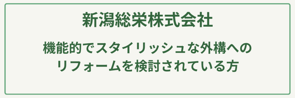 | ポイント | 全国規模のコンテストで入賞実績を誇る、新潟屈指のデザインと提案力/天然石張りによるリフォームなど、他社とは一線を画す「本物志向」の施工技術/新潟市を中心に新発田市や三条市まで幅広くカバーする、地域に根ざした活動/予算やプランニングの透明性を大切にし、お客様と一緒に理想を形にする姿勢 |