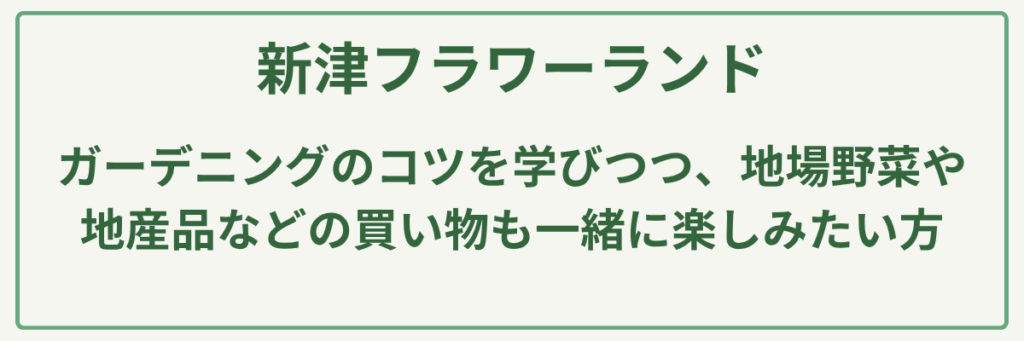| ポイント | 新潟県内最大級の規模を誇り、季節を問わず高品質な植物に出会える安心感/生産者直営だからこそ可能な、リーズナブルで多種多様なラインナップ/毎月定期的に開催される「フラワーランドの日」などの割引・イベントが充実/併設店での軽食や地場野菜の販売もあり、家族で半日楽しめる充実した施設内容 |