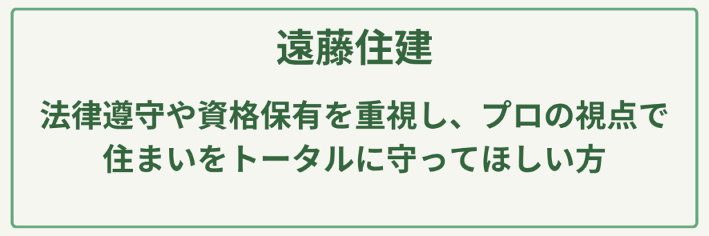 | ポイント | 2011年開業の豊富な実績。旧「富士エンタープライズ」時代から続く地域に密着した多機能なサポート体制が魅力/一般建築業許可や産業廃棄物処理業など、多数の公的資格を保有。コンプライアンスを重視した質の高い施工・管理を提供/女性スタッフが在籍。女性や高齢者の一人暮らしでも安心して依頼できる、きめ細やかで安心感のある対応が強み/庭木の伐採からリフォーム、生前整理・遺品整理まで、住まいのライフサイクルに合わせたあらゆる困りごとを解決できる一貫体制 |