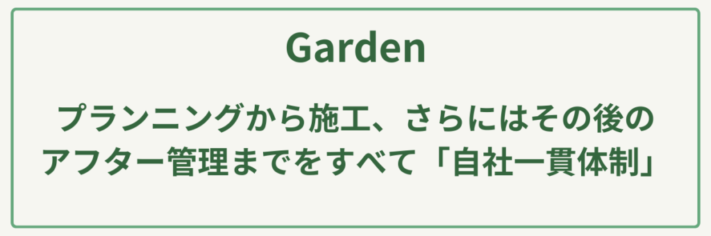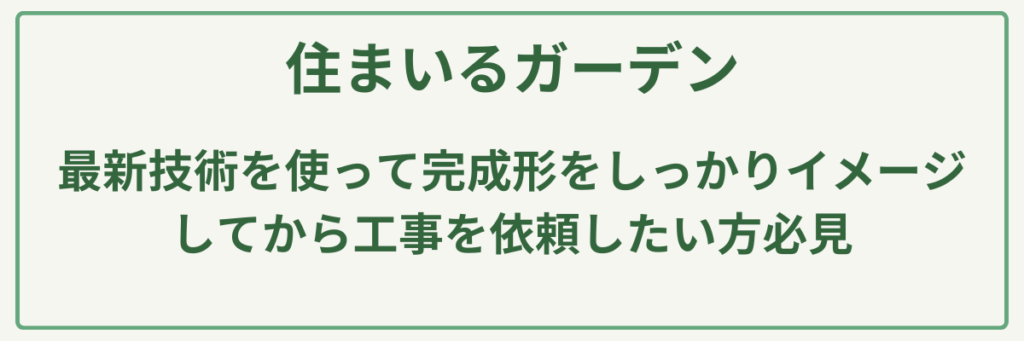 | ポイント | 最新CADシステム導入により、スマートフォン等の3D映像で完成後を体感できる先進の提案力/お客様の「こだわり」を形にする完全オーダーメイドのオンリーワン設計/「住まいる工務店」との連携による、建物と一体感のあるハイクオリティな外構プロデュース/じっくり相談ができる専用ガーデンギャラリー完備/人工芝やリガーデンなど、メンテナンス性を考慮した現代的なお庭づくりが得意 |