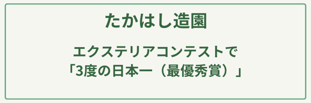 | ポイント | 創業35年以上/LIXIL・YKK AP等のエクステリアコンテスト最優秀賞(日本一)3回受賞/11年連続コンテスト入賞中の圧倒的なデザイン提案力/1級造園施工管理技士在籍/エクステリアマイスター認定施工店/自社一貫施工による高クオリティな仕上がり/住宅と庭を一体化させる「One Garden」コンセプト |