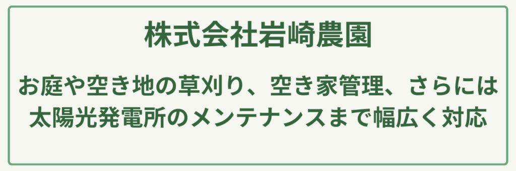| 対応サービス | 草刈り・剪定・空き家管理・清掃活動・太陽光発電所メンテナンス |