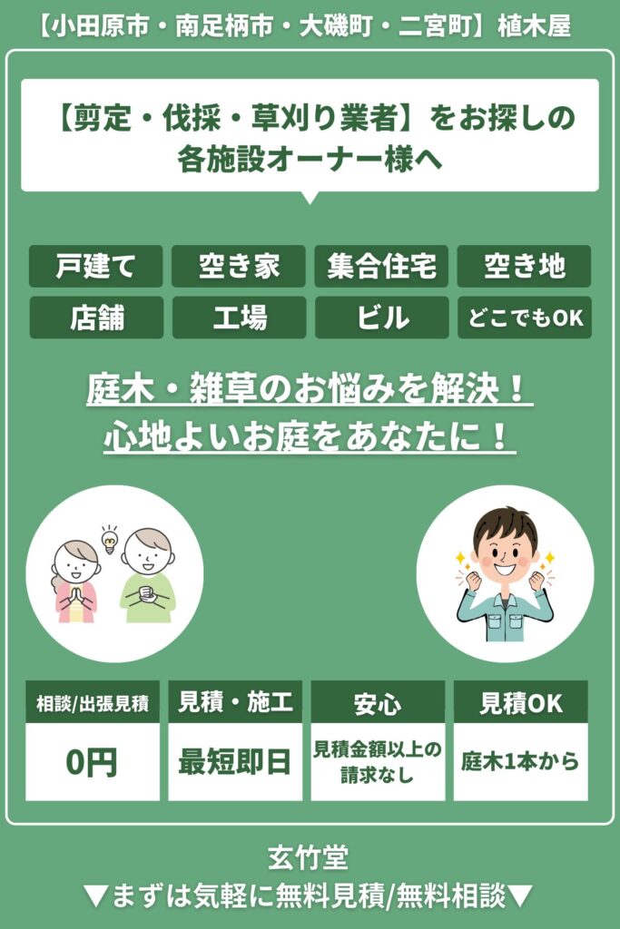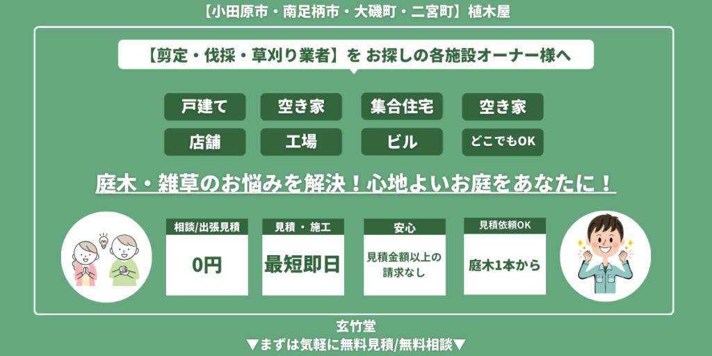 | 対応サービス | 庭木の剪定・草刈り・除草・一般軽作業 等 |