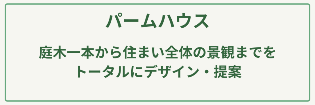 パームハウスは、神奈川県大磯町を拠点に「庭みたいな家、家みたいな庭」をコンセプトに掲げる、建築と造園の融合を得意とするプロフェッショナルです。単なる剪定業者ではなく、ハウスメーカー出身の知識と造園の技術を併せ持っており、庭木一本から住まい全体の景観までをトータルにデザイン・提案できる点が最大の強みです。