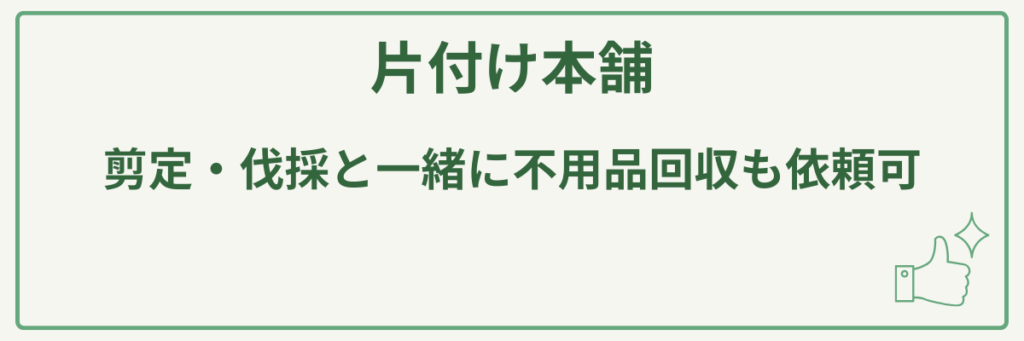 そのため、庭木の剪定・伐採で出た大量のゴミや不用品を、認定許可証を持つ信頼できる業者に、追加料金の不安なく回収処分してもらいたい人におすすめの片付け業者です。