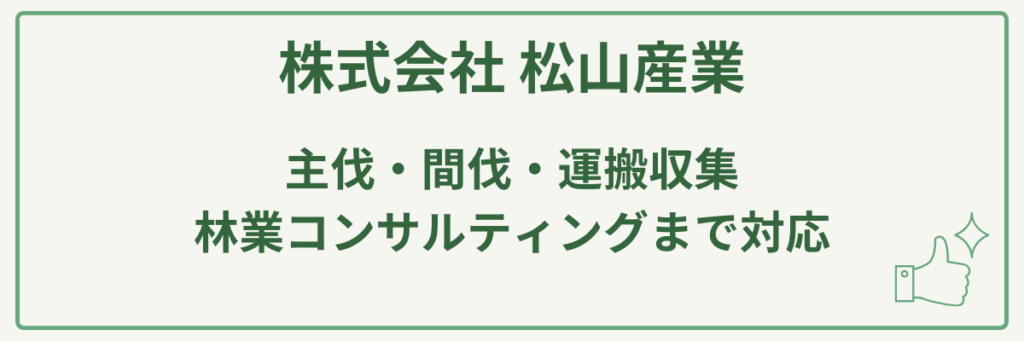 株式会社 松山産業は、創業50年を間近に控えた長年の実績と、主伐・間伐・運搬収集・林業コンサルティングまで林業のあらゆる分野に対応できる総合力が最大の強みです。
