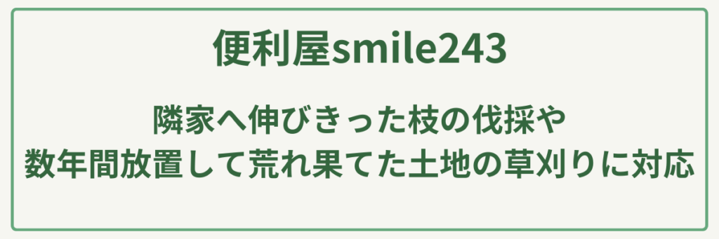 広島県大竹市や山口県東部を拠点とする「便利屋smile243」は、年間作業実績200件以上を誇る、**「24時間365日いつでも頼れるスピード対応」**が最大の強みの便利屋です。庭の手入れにおいては、専門業者に引けを取らない高いクオリティを維持しており、隣家へ伸びきった枝の伐採や、数年間放置して荒れ果てた土地の草刈りといった、自分では手の付けられない困難な現場を得意としています。