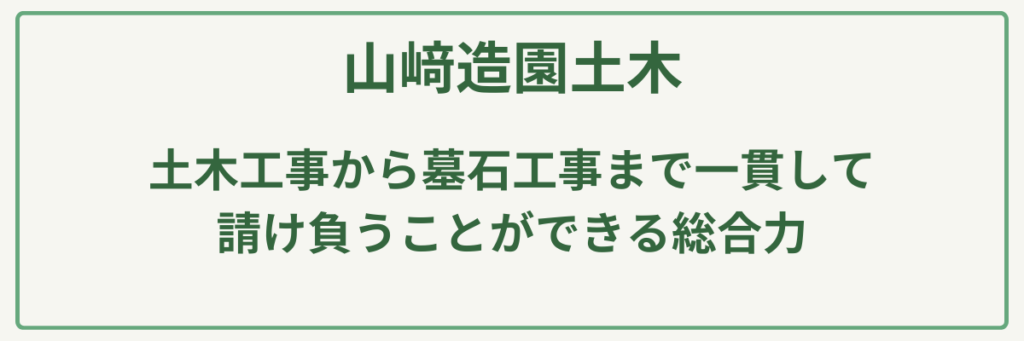 | ポイント | 土木工事の豊富な実績/擁壁・基礎工事対応/墓石新設・修繕対応/和風庭園から洋風外構まで幅広く対応/アフターサポート充実/東京都・埼玉県の一部地域に密着対応/ |