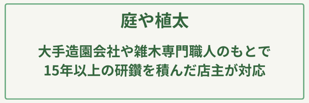 | ポイント | 造園会社での10年間の修行を経て独立した「確かな現場経験」/木本来の形を美しく整える「自然風仕立て」への専門性/「追加費用の勝手な上乗せなし」を明言する誠実でクリーンな運営/夫婦経営ならではの「親しみやすく丁寧なコミュニケーション」/植木一本から予算に合わせて柔軟に対応する「地域密着の小回り力」 |