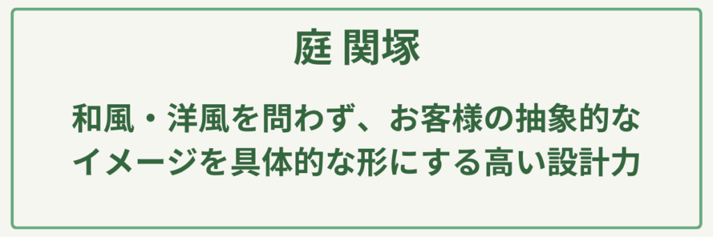 | ポイント | 自然素材を活かした作庭/和風・洋風問わないトータルコーディネート/関東一円(一都六県)の広域対応/1本単位ではなくお庭全体のバランスを重視した管理/店舗やマンションの植栽管理実績あり/ |
