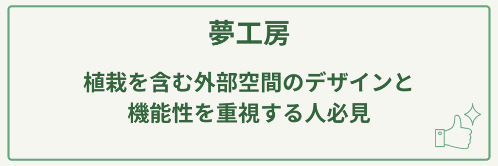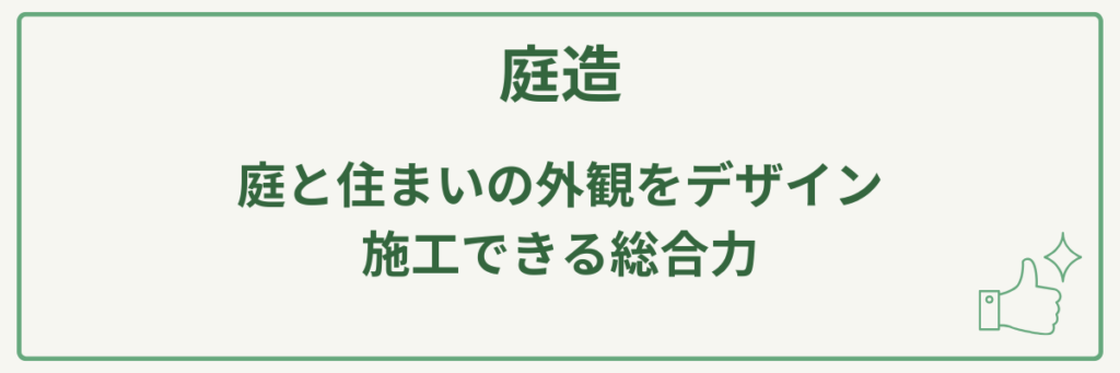 | 対応サービス | 庭造り、新築外構工事、庭リフォーム、エクステリア商品(照明、カーストッパーなど)、高機能人工芝(リアリーターフなど)の施工 |