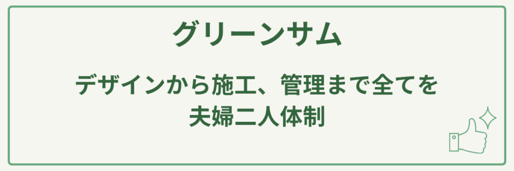 グリーンサムは、デザインから施工、管理まで全てを夫婦二人体制の専門家が責任を持って手掛けるため、コストを抑えつつ、お客様の住まい方やインテリアに合わせた、きめ細やかで一貫性のある庭・エクステリアの空間プロデュース力が最大の強みです。
