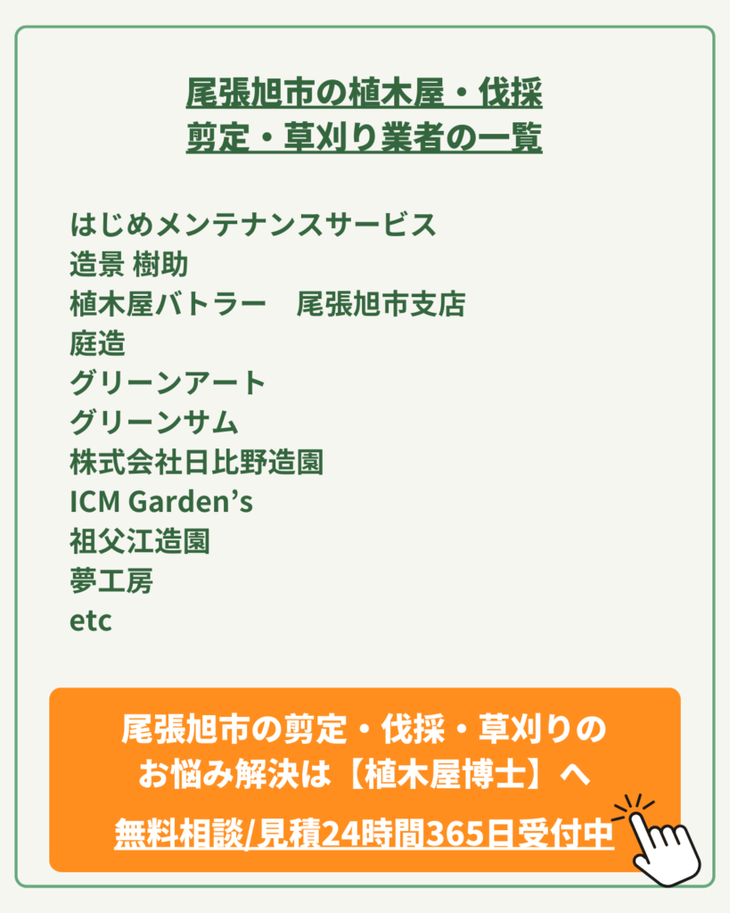 植木屋(剪定・伐採・草刈り業者)選びでお悩みの方は、是非この機会に植木屋博士の無料相談・無料見積をご活用ください。