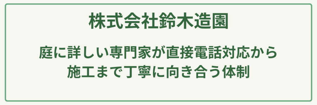 | ポイント | 創業42年の信頼と実績/千葉県知事許可(般-2)第19069号/1級造園技能士在籍/1級造園施工管理技士在籍/高所作業車・ユンボ等の特殊機器完備/専門家による直接電話相談/特許取得の独自技術あり |