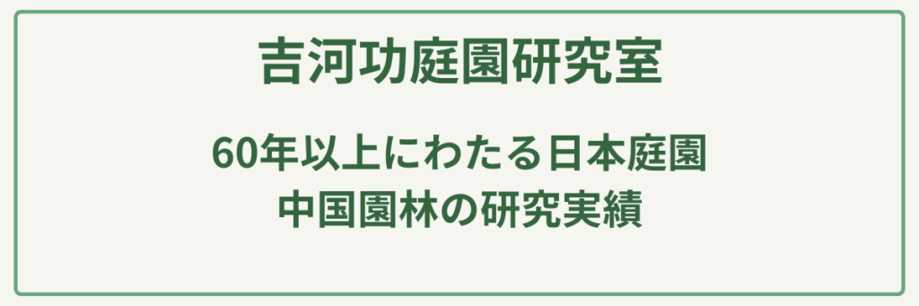 千葉県山武市に事務局を構える吉河功庭園研究室は、**「60年以上にわたる日本庭園・中国園林の研究実績」を持つ、国内屈指の権威が運営する庭園専門組織です。最大の強みは、代表である吉河功氏の膨大な知識に基づく「学術的根拠に基づいた庭園の設計・監修・改修」**にあります。単なる植栽管理にとどまらず、庭園史や石造美術、庭園美学を深く解釈した上で、その空間が持つ本質的な美しさを引き出すプロフェッショナル集団です。