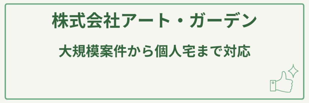 株式会社アート・ガーデンは、公共施設や民間企業、個人邸庭園の造園・外構工事、マンションの緑地管理までを幅広く手掛けており、大規模案件から個人宅まで対応できる高い空間デザイン力と確かな施工実績が最大の強みです。