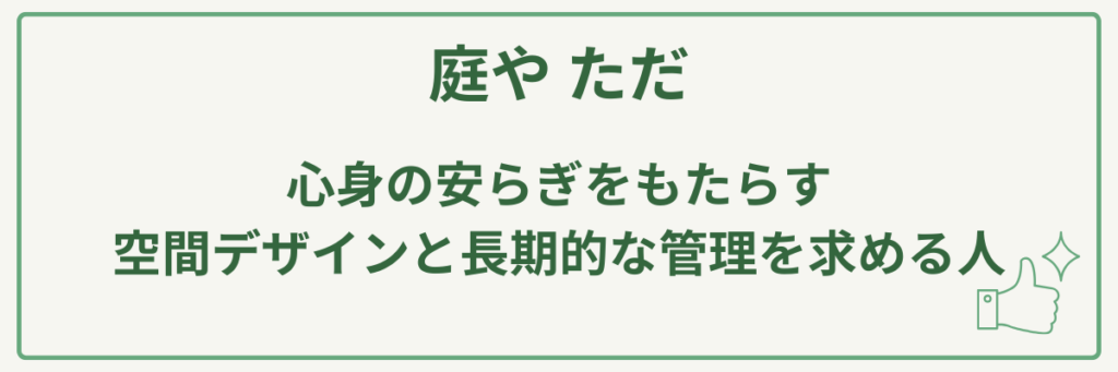 庭や ただは、自然との調和を重視した「和文化が息づく庭づくり」の提案力と、デザインから工事、その後の保守管理までを一貫してサポートする体制が最大の強みです。