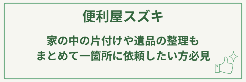 便利屋スズキは、庭の手入れから不用品・遺品整理、清掃まで、暮らしの困りごとを幅広く解決できる総合的な対応力と地域密着の親身なサービスが最大の強みです。