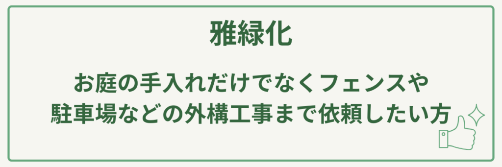 | 対応サービス | 造園工事(剪定、植栽、伐採、消毒、追肥、芝刈り、草刈り、防草シート)、外構工事(フェンス・門扉設置、舗装工事、テラス・デッキ設置、造成工事) |