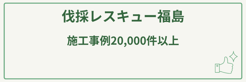 福島県全域に対応する「伐採レスキュー福島」は、顧客満足度98.7%、施工事例20,000件以上(約20,000件を突破)の実績と、年中無休・最短即日30分で駆けつけるスピード感が最大の強みです。自社で直接作業を行うため中間マージンが発生せず、高品質な施工を低価格で提供しています。