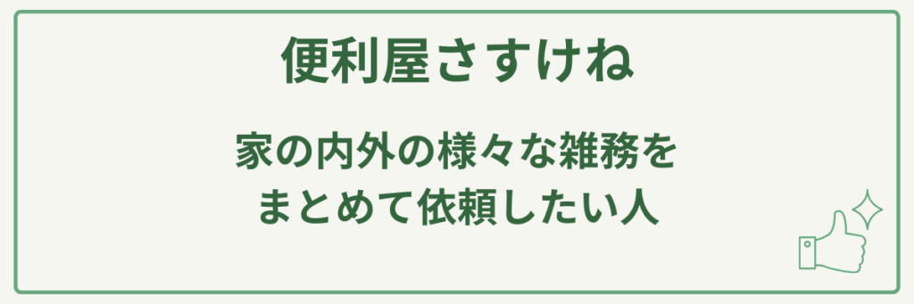 そのため、「庭木の剪定と、大掃除や不用品の整理など、家の内外の様々な雑務をまとめて依頼し、便利に解決したい人」におすすめ。