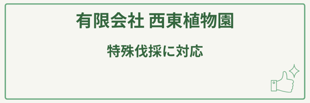 福島県南を中心とする「有限会社 西東植物園」は、公共施設から企業、個人宅まで幅広く対応し、特殊伐採や樹勢回復など高度な専門技術を要する作業に強みがあるため、「大切な古木の管理や、高難度の特殊伐採を安心して任せたい人」や「景観向上と地元住民の安全を守ることを両立できる、信頼性の高い造園業者を探している人」におすすめです。