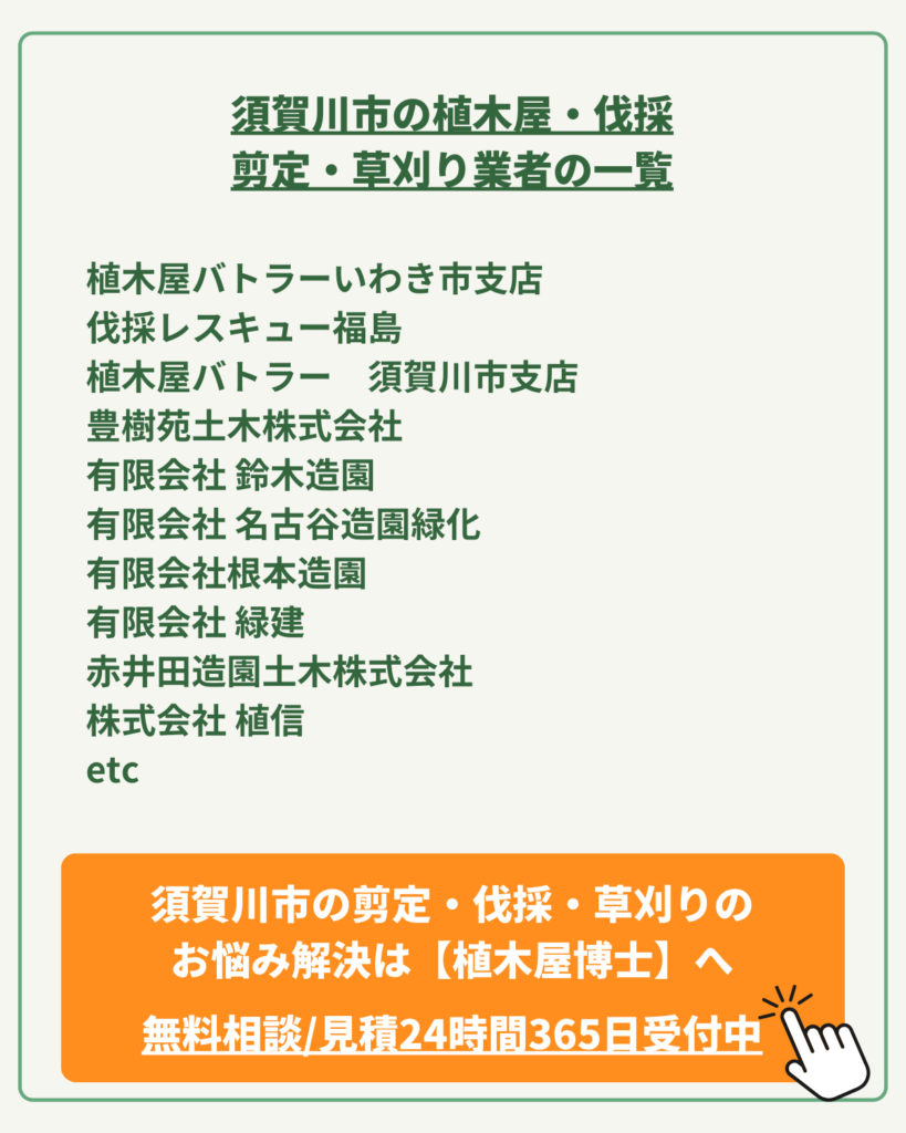 | 対応場所 | 個人宅の庭、空き家、その他(福島市を中心とした福島県・宮城県) |