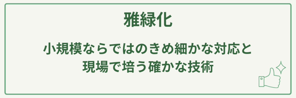 | 対応サービス | 造園工事(個人邸・庭園・公園)、エクステリア、外構土木、大径木移植/伐採、屋上・壁面緑化、緑地造成、遊歩道設置、メンテナンス、剪定 |