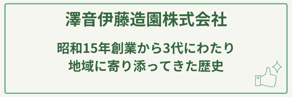 澤音伊藤造園株式会社は、昭和15年創業から3代にわたり地域に寄り添ってきた歴史と、造園・土木・外構工事のプロとして一貫して対応できる点が最大の強みです。
