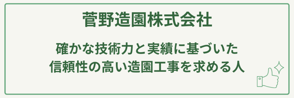 そのため、難易度の高い大径木の伐採や移植、または公共性の高い緑地整備など、確かな技術力と実績に基づいた信頼性の高い造園工事を求める人におすすめの業者です。