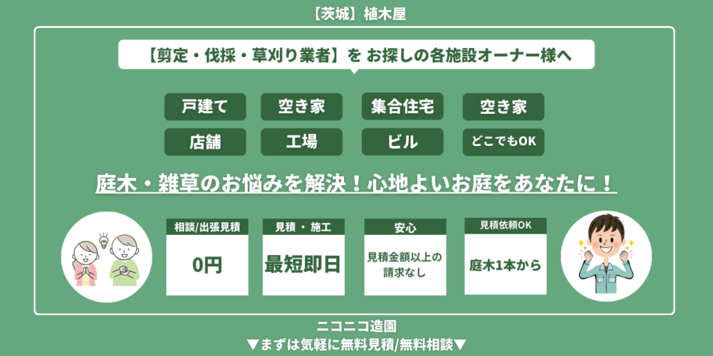 植木屋(剪定・伐採・草刈り業者)選びでお悩みの方は、是非この機会に植木屋博士の無料相談・無料見積をご活用ください。