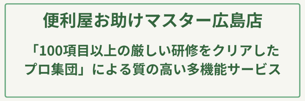 広島県竹原市をはじめ県内全域をカバーする「便利屋お助けマスター広島店」は、「100項目以上の厳しい研修をクリアしたプロ集団」による質の高い多機能サービスが最大の強みです。植木の剪定や伐採はもちろん、不用品回収、遺品整理、ハウスクリーニングまで、住まいの悩みをワンストップで解決できる圧倒的な対応力を誇ります。